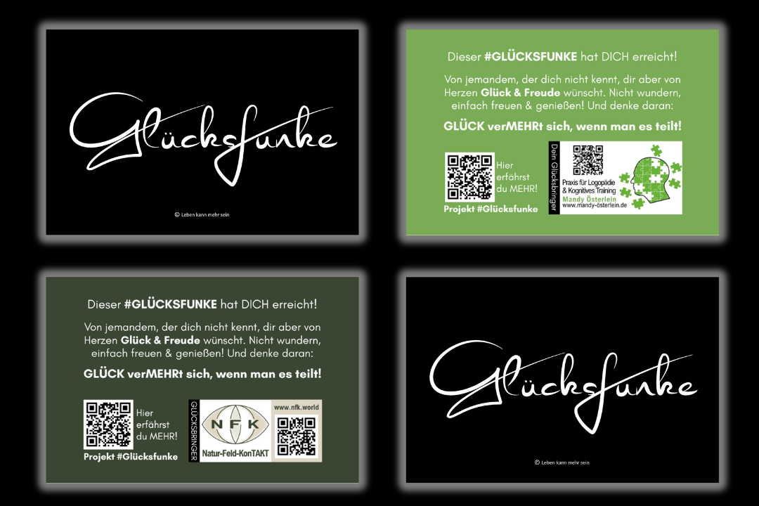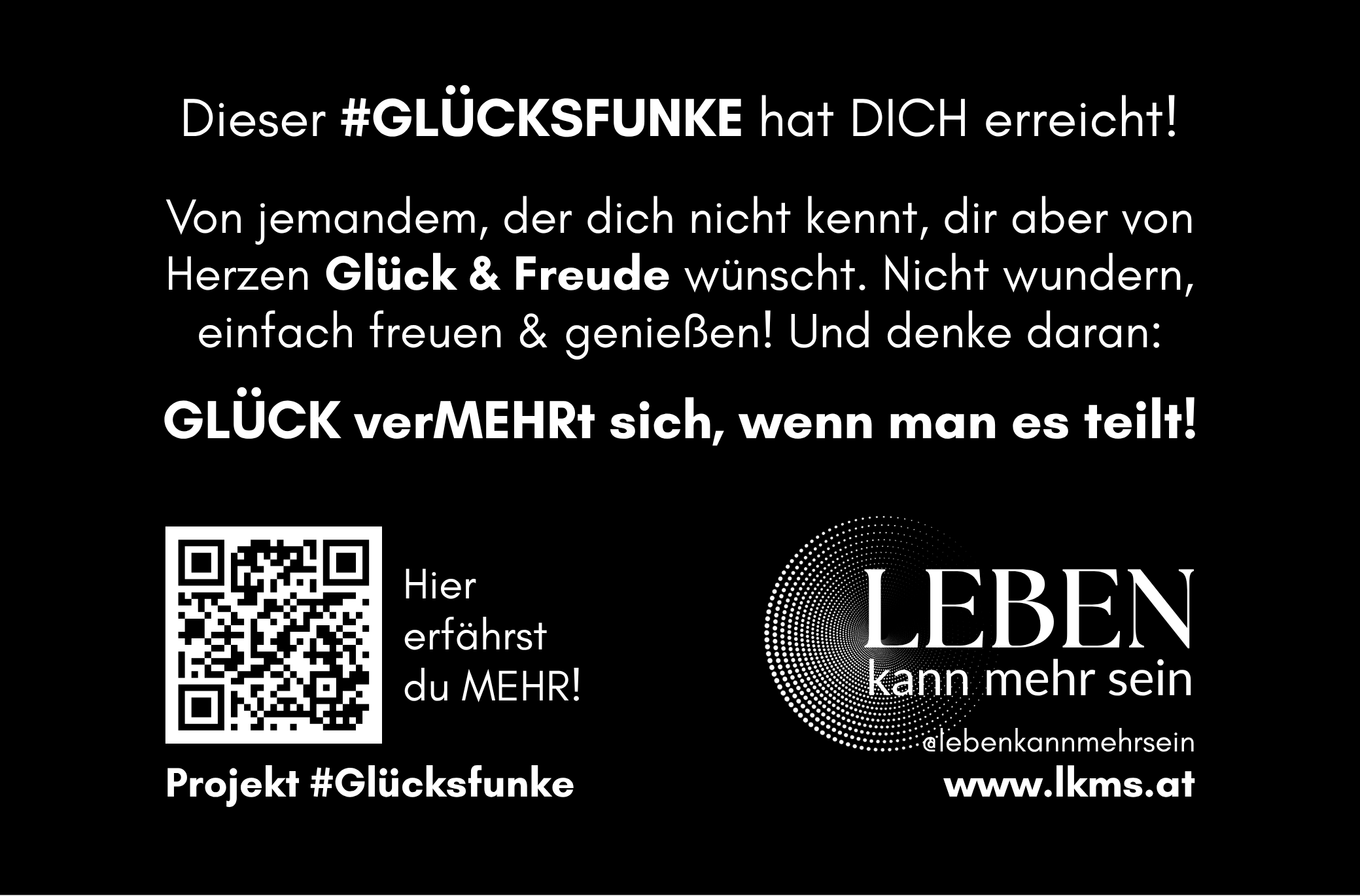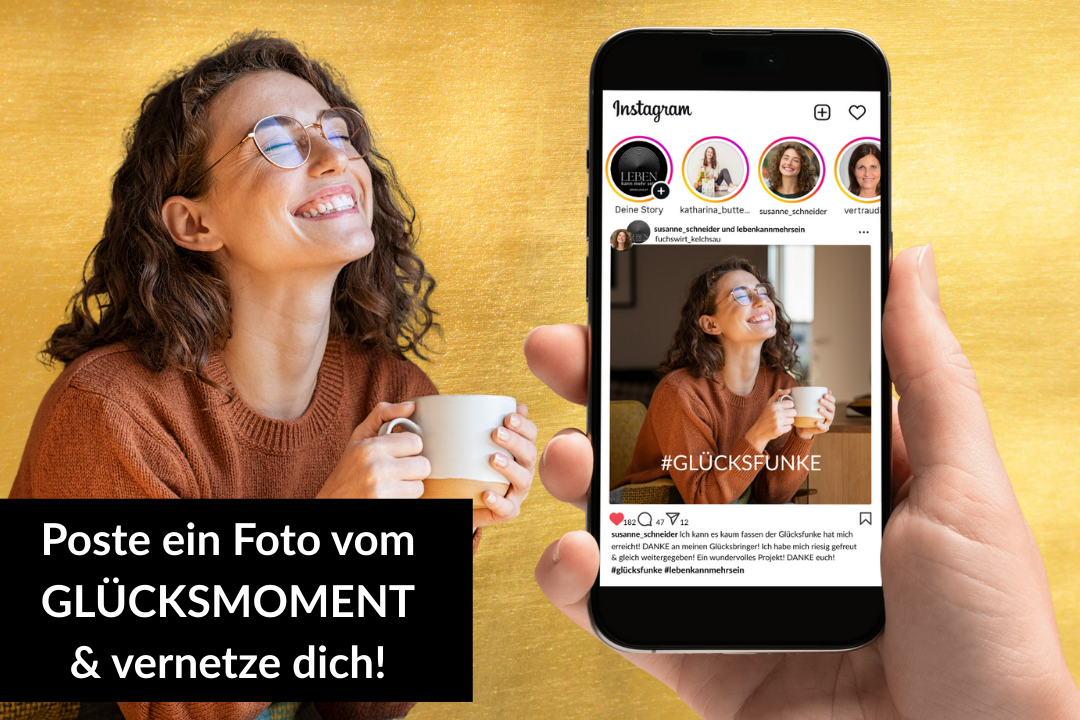Halte diesen Moment fest! Mach ein Foto von DIR mit deiner #GLÜCKFUNKE Karte & poste es in den sozialen Netzwerken mit dem Hashtag: #GLÜCKSFUNKE, dem Datum, den Ort/Lokal wo du ihn erhalten hast & markiere @lebenkannmehrsein. Folge uns, damit du erfährst, WER dein Glücksbringer war. Wir posten eure Post`s in den Stories & in den Highlights #glücksfunke.