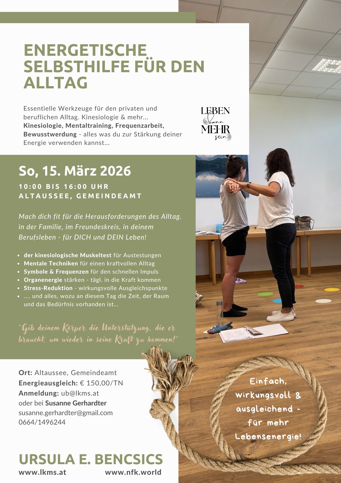 Dieser Workshop führt dich praxisnahe ein, in die Arbeit mit Kinesiologie, Mentaltraining, Frequenzarbeit & Bewusstwerderung. Mach dich fit für die Herausforderungen des Alltag. In der Familie, im Freundeskreis, in deinem Berufsleben - für DICH & DEIN Leben! Du lernst den kinesiologischen Muskeltest für Austestungen. Mentale Techniken für einen kraftvollen Alltag. Symbole & Frequenzen für den schnellen Impuls. Organenergie stärken - um täglich in deine Kraft zu kommen. Stressreduktion - wirkungsvolle Ausgleichspunkt und alles wozu an diesem Tag Zeit, Raum und Bedürfnis vorhanden ist.