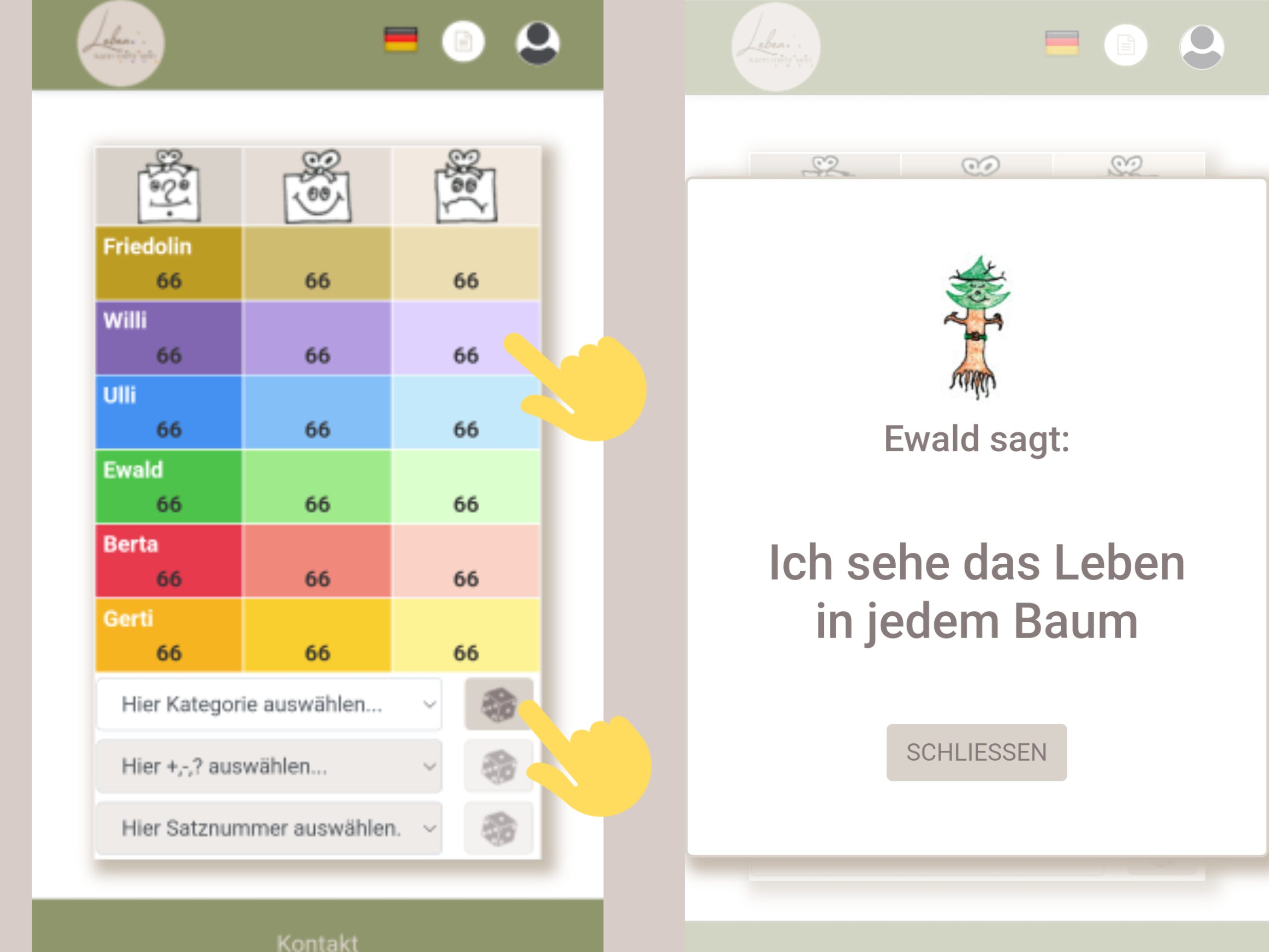 Mit wenigen Klicks bekommst du deinen gewünschten Satz am Display angezeigt. Und natürlich zeigt sich auch der Bewohner, der grade mit dir spricht. Zusätzlich hast du die Möglichkeit den Zufallsgenerator "Würfel" zu nutzen um wie gewohnt vom Buch einen Satz zu erwürfeln.