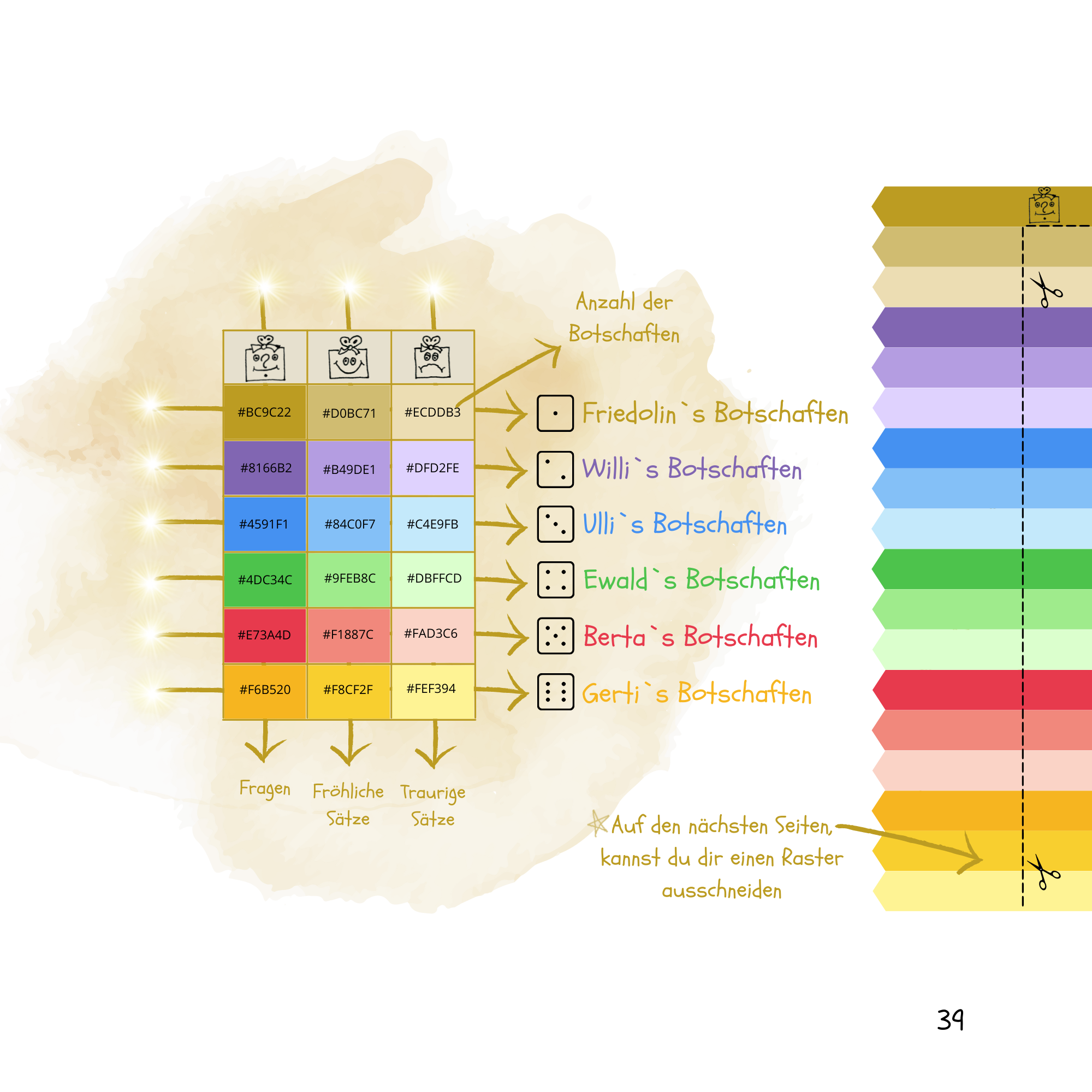 Aus dem Buch "Friedolin und die Flüsterfreunde" ist dieses Kartenset "Botschaften aus Anderswo" entstanden. Friedolin und seine 6 Freunde schicken dir kraftvolle Botschaften (positive Affirmationen), die dich stärken dürfen. Sie zeigen dir auf, welche unglaublichen Fähigkeiten in dir stecken. Jeder dieser Freunde kommt von einem anderen Planeten. Jeder Planet hat ganz spezielle Botschaften für dich bereit.